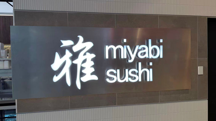 The Miyabi Sushi illuminated sign shines with a crisp, consistent light that naturally pulls attention and highlights its sleek, refined design.