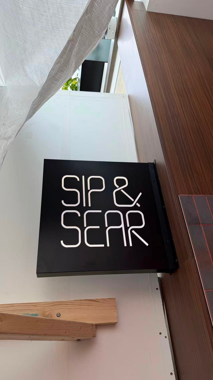 The Sip & Sear illuminated board sign offers a bright, even glow that elevates the brand’s visibility and adds a refined, modern touch.
